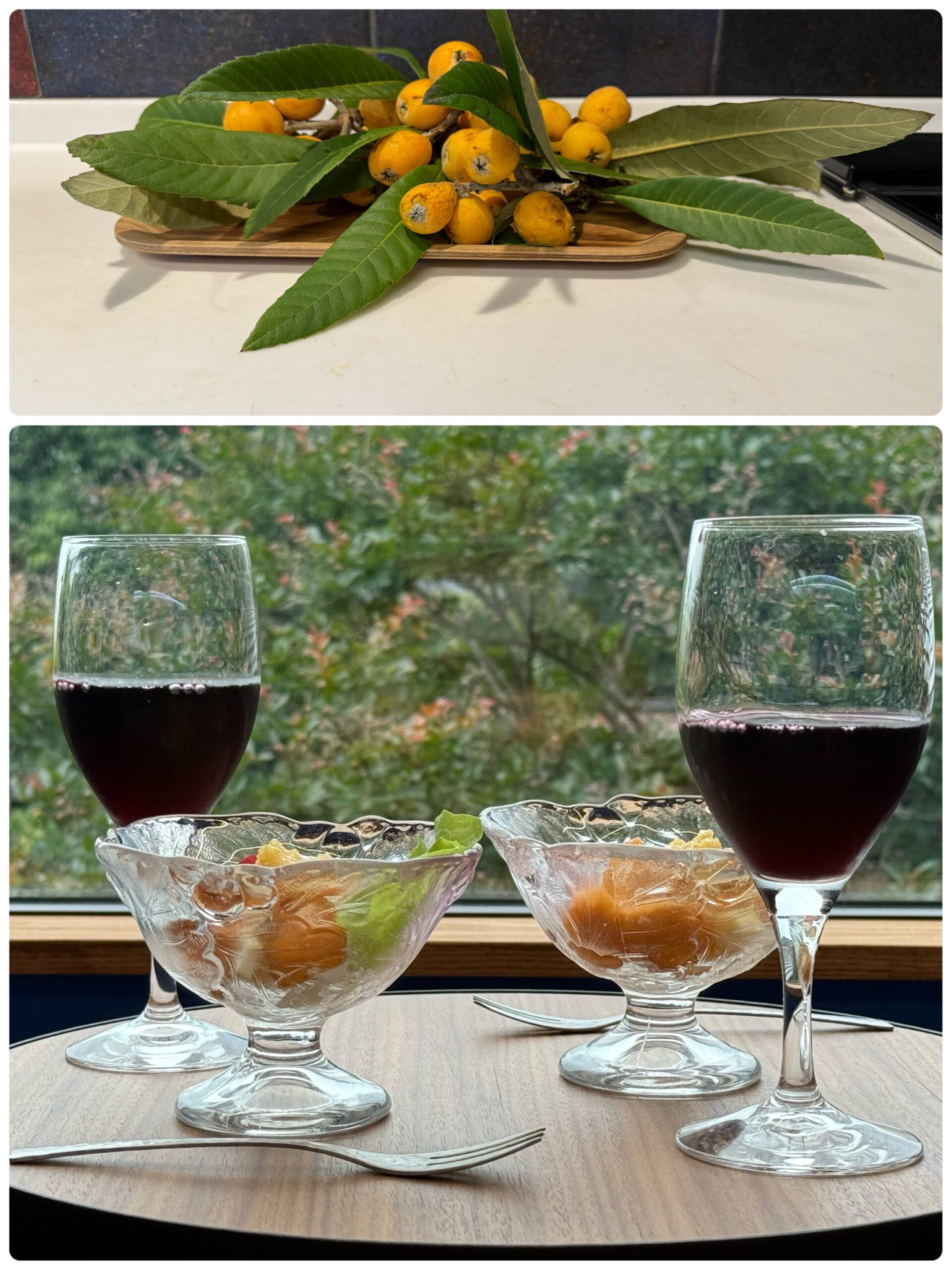 出来上がったところを見たら、これはワインだろうとまだ外が明るい時間だけど、庭を見ながら二人でちょっといただいてしまいました。