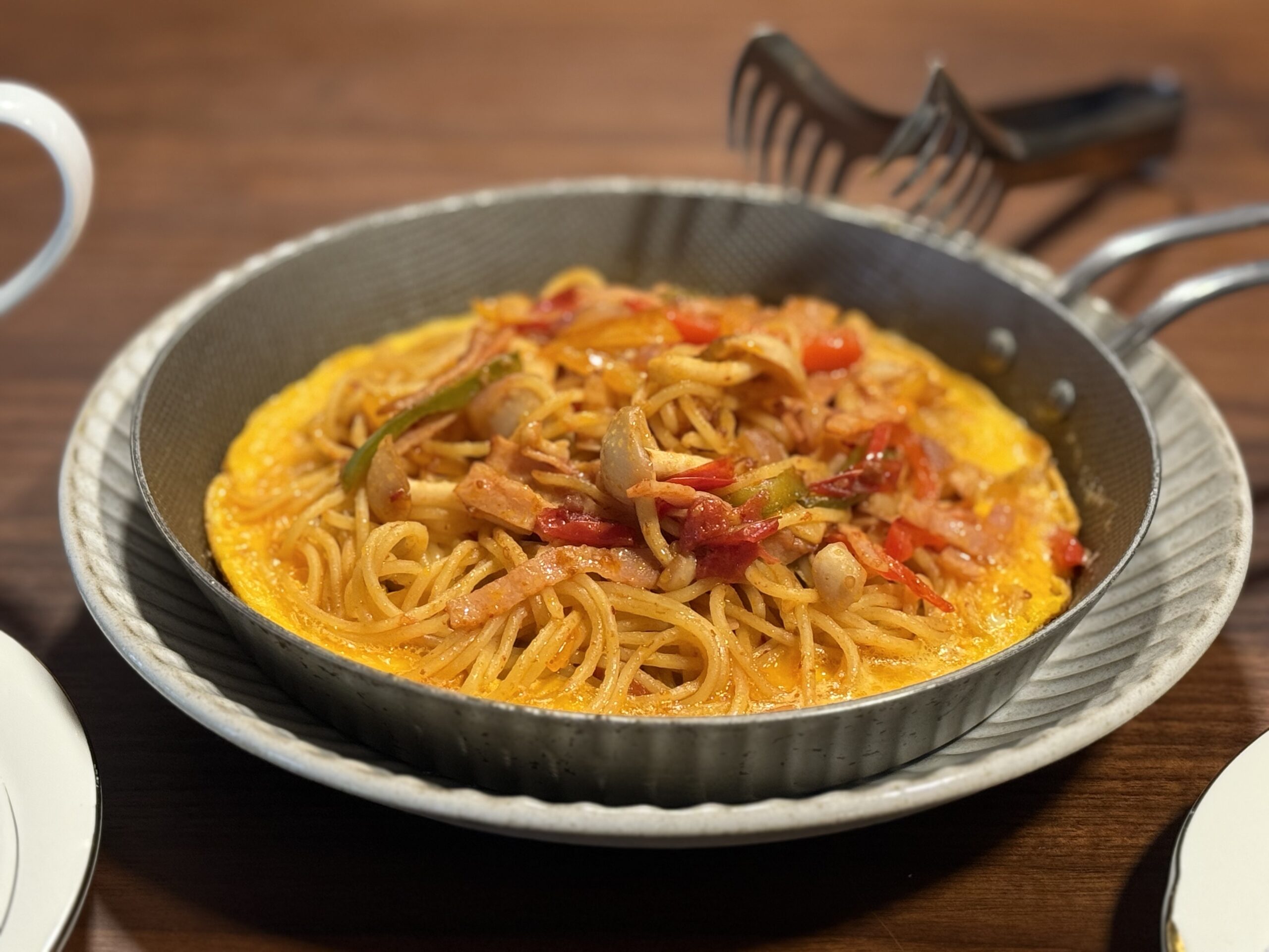 そこへスパゲッティ麺を入れてよく絡めて全体に均一な色合いになるようにします。ほんとはこれで良いんですが、今回は別の鉄鍋に盛り付けてみました。ふんわりと言った感じで盛り付けて、周りによく泡立てた卵を流し入れて、卵が固まるまで焼いていきました。これで麺の下側が少し焦げて得も言えない美味しさになるのです。
