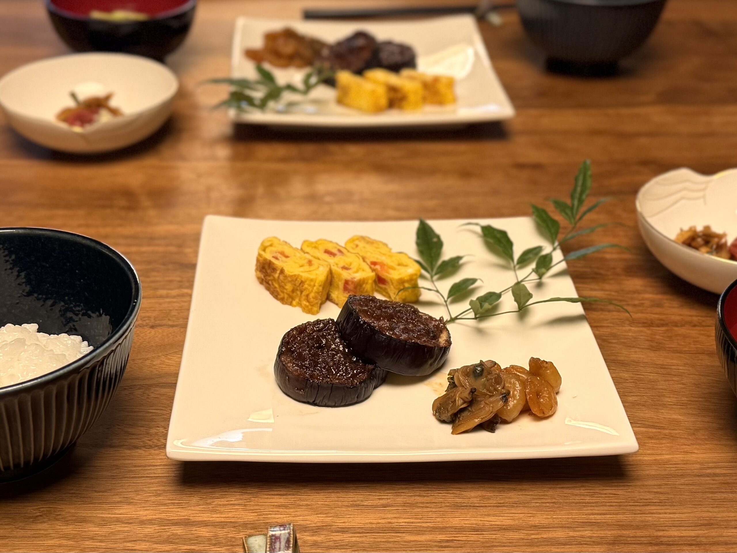 後は水気を切ったトマトを細かく刻んで卵とお出しを混ぜたら卵焼きです。先日のたこ焼きの際に余ったアサリと小エビは佃煮風に煮つけておきます。