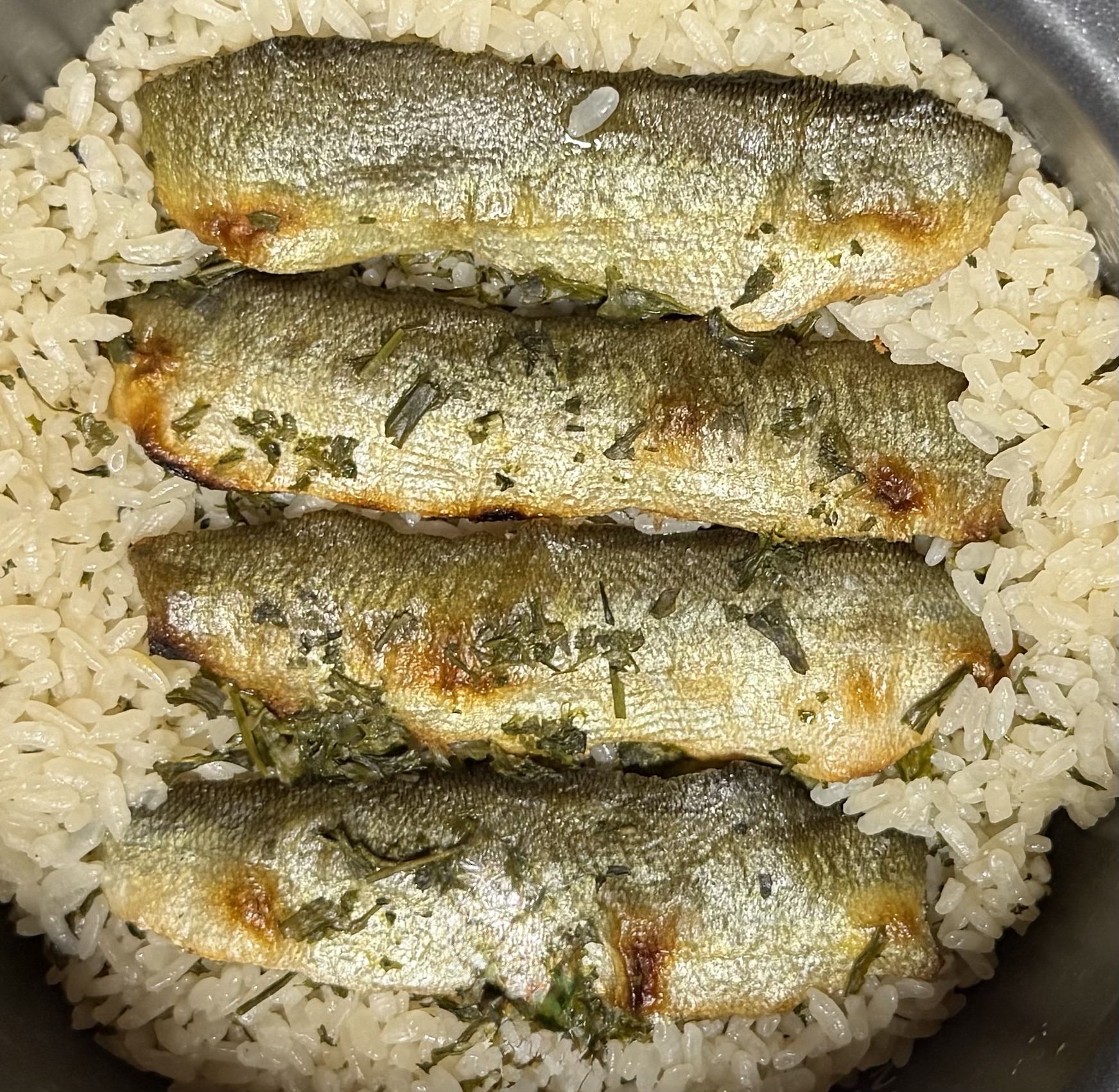 それでは作ります。鮎を炊き込んだ時に大きな鮎ですとやはり骨が問題になるので、最初に三枚におろしてから皮面にお塩をしてキッチンぺーパーで押さえて軽く水分を抜いておきます。ある程度水分が抜けたらオーブンで両面を焦げ目が軽く付く位に焼いておきましょう。それを炊飯器に入れてお醤油、味醂、お砂糖を混ぜたもの(味は佃煮の甘さ程度)を水が薄く醤油色が付く程度に適当量入れて、お茶の葉を散らしておきます。お茶の葉を入れると臭みが抜けますし、ほのかなお茶の香りが楽しめる上にお米の色が良くなります。今回は、さえみどりの新茶を一緒に炊きました。さえみどりは香りが良くて苦みが少ないので、炊き込みご飯には最適です。