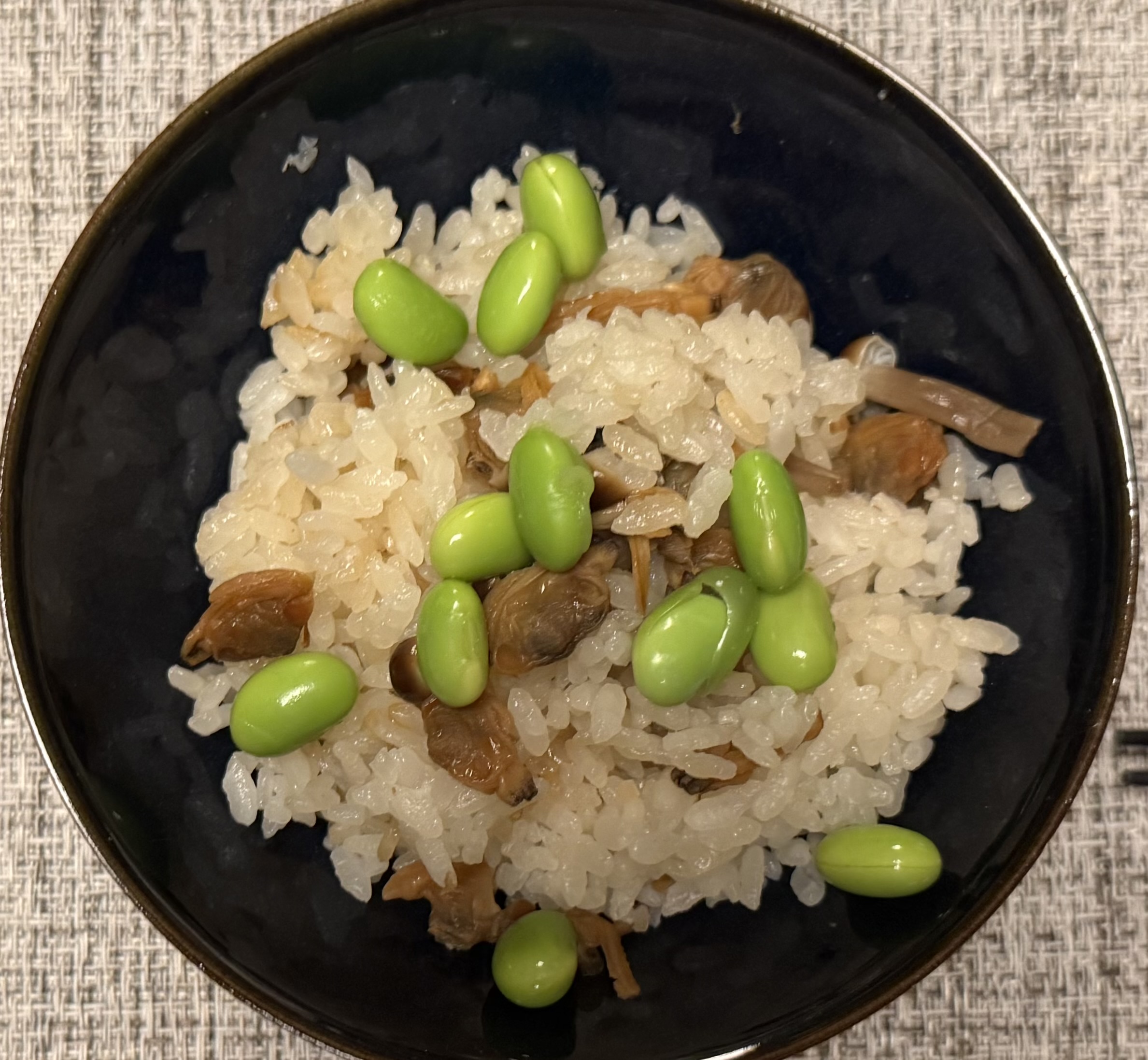 炊き込みご飯は簡単です。アサリの佃煮がありますからそれを使えば一発で成功です。この時にアサリの佃煮は添加物のないお醤油とお砂糖などだけで作られたものを選びましょう。今日は、キノコを一緒にいれてみましょうと、エノキ茸の茶色いのを入れて炊きました。ご飯の味は、アサリの佃煮だけで十分なので入れすぎないように注意ですね。