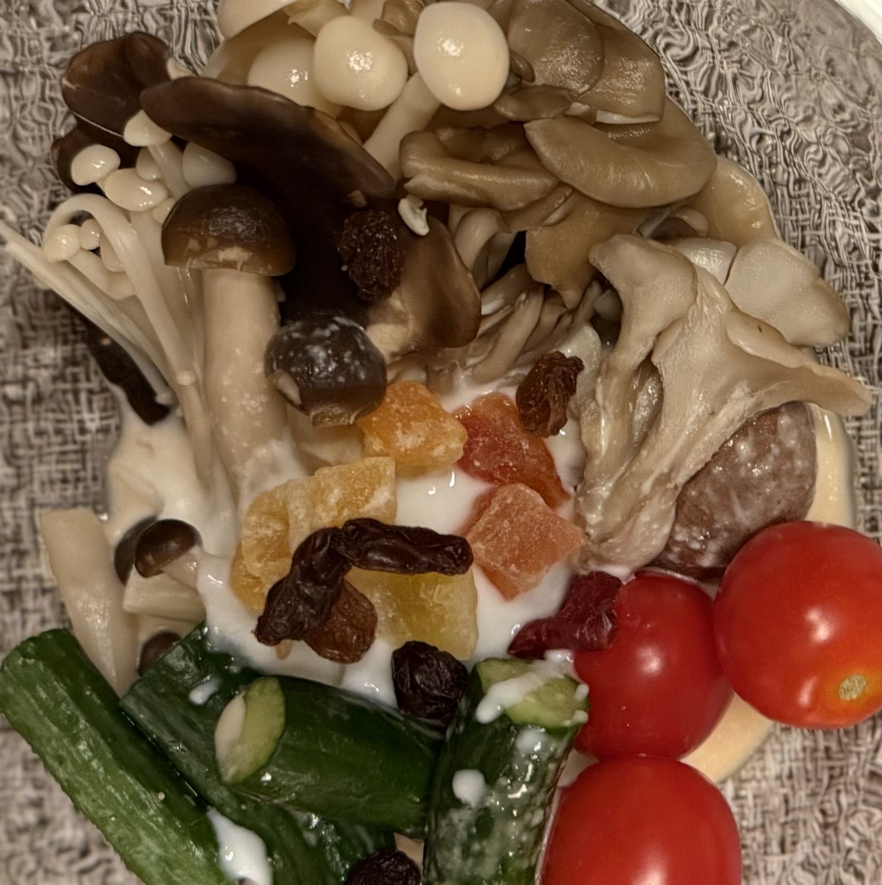 秋の雰囲気を先取りとして、サラダには茸のいろいろを茹でて用いました。