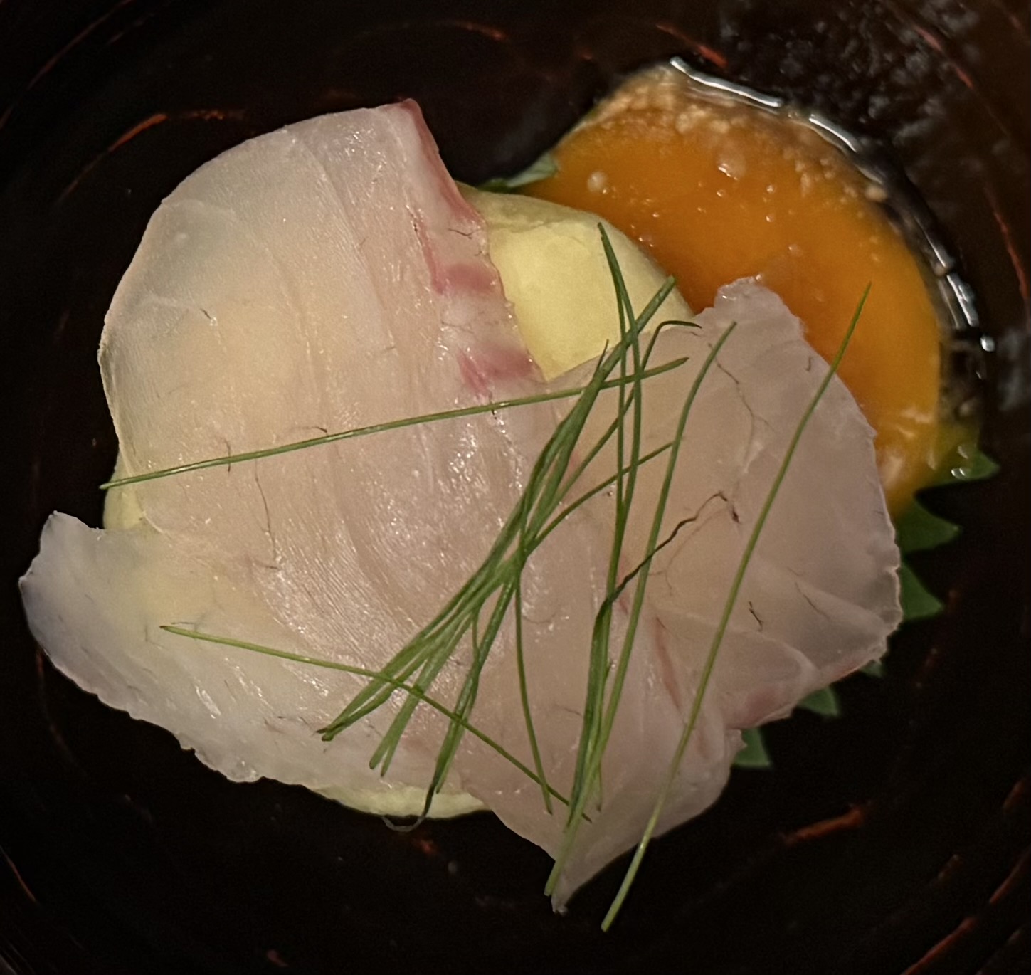 汁物には、サツマイモ団子を作りました。サツマイモを適当量茹でて、ジャガイモも茹でておきます。これらをつぶしてラップで茶巾絞りに団子にしておきます。ここに先ほどの昆布締めの鯛のお刺身を載せて、味噌卵を添えて、最後は熱いだし汁をかけていただきます。