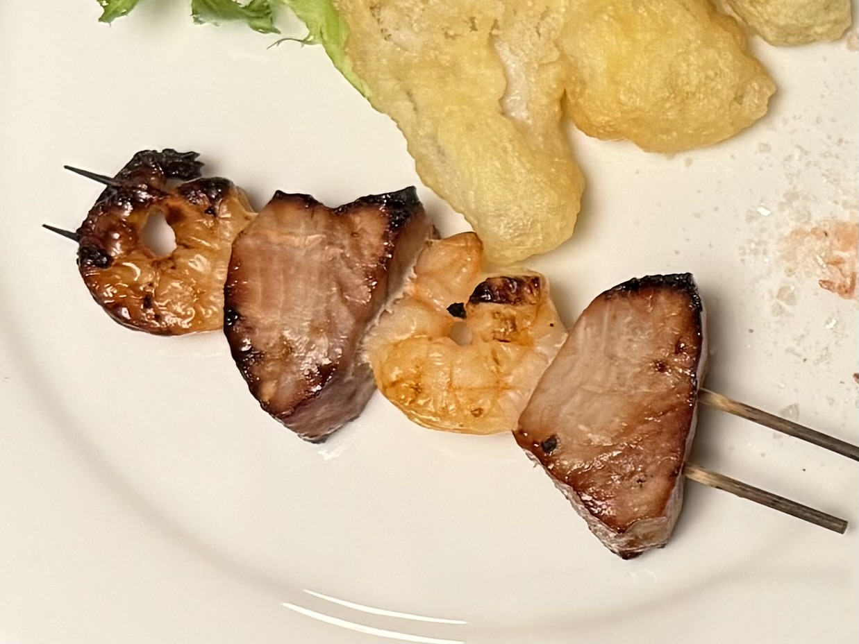 カツオと小エビは焼き鳥風にして、エシャレットとキスがあったので天ぷらに、スイカも少し残っていたので白いところを含めて天ぷらにしてみました。これが美味しいのです。