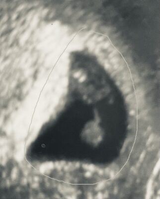 これと似た胎芽画像は、なかなか難しくて一枚だけありました。分かりにくいですが、まるで囲った部分を、子宮内の胎嚢と言い、胎児が育っていく部屋みたいなものです。超音波画像なので、水の部分は黒く映りますので、胎嚢内に羊水が充満しています。その中の上方のモヤモヤした部分を胎芽と言い、これからやがて胎児の形になっていきます。もう心臓は動いています。