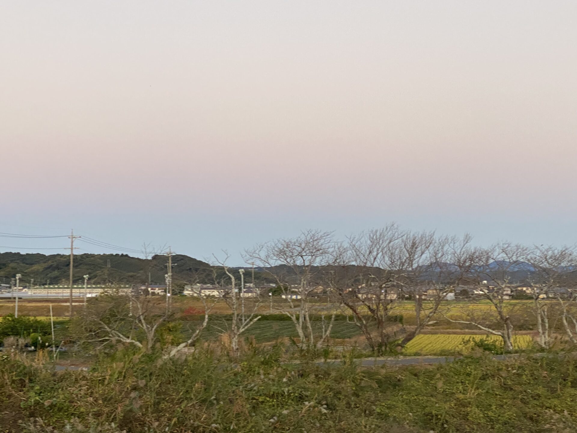 この時間の空の移り変わりが良いのです。僕のウオーキングコースには広々とした場所があるわけではないので、一部ずつの切り取りしかないけれど、ピンクの空の山端に水浅葱色の空が見えます。夜明け前のブルーブラックの空がだんだんに薄められていくのですね。まさに黎明、この一瞬しかない朝のグラデーションが良いのです。