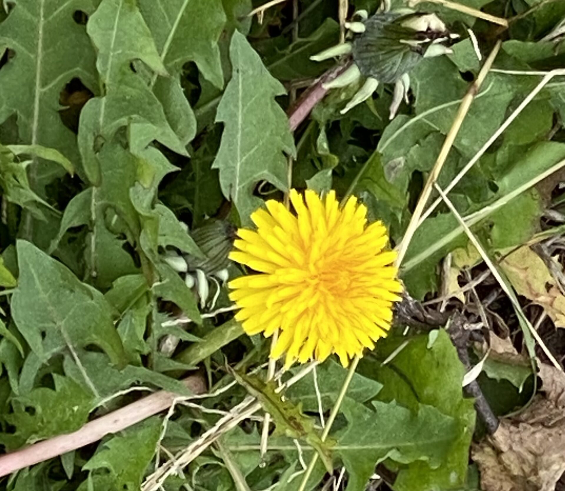 冬の中にある春、暖かい風が心地よい道端の草むらの中には、タンポポが大きく花を付けています。川の土手には顔をめがけてやってくる虫たちもいて、初夏かと間違うくらいでした。今日は晩秋と春が混在している日だったです。
