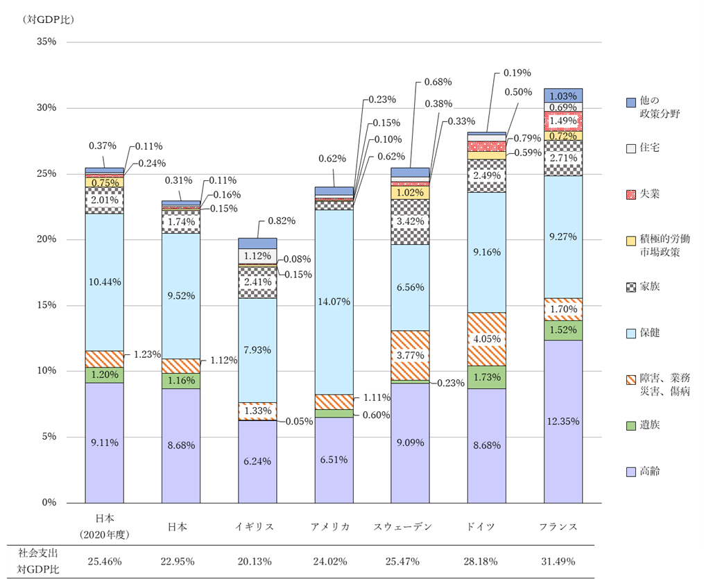 さて、僕たちが関わることになる財政政策中の社会保障ですが、2019年の日本の社会支出(対GDP比)は22.95%、日本の分は2020年分も示されていますが25.46%となっています。こんなに増加したんだぞって風にも見えますが、この日本の社会保障費(対GDP比)は果たしてそんなに高いのでしょうか。社会保障費は対GDPで算出されていますのでGDPが低ければ国民の負担感は大きくなりますね。因みに先進国と言われる国の社会支出の2019年の対GDP比はイギリスの20.13%からフランスの31.49%であり、その平均は約25%です。