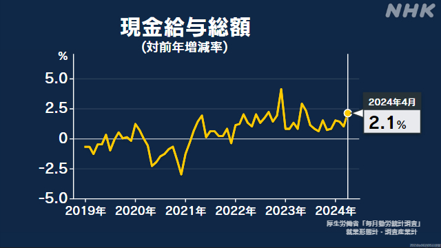 「現金給与の総額」前年同月比 2.1%増、と表題が付けられていますけれど、図を見ると確かに2021年からプラトーですね。