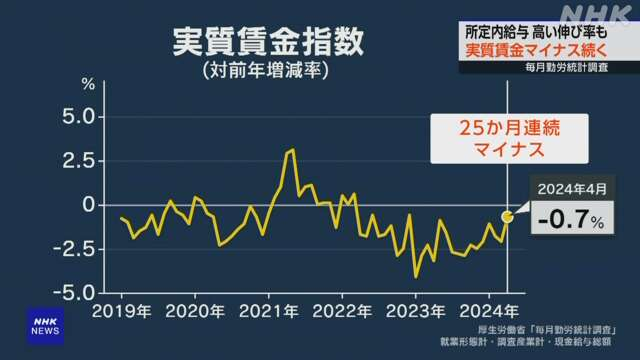 「実質賃金指数」前年同月比 0.7%減 25か月連続のマイナス、と表題が付けられています。これもマイナスが続いていますね。